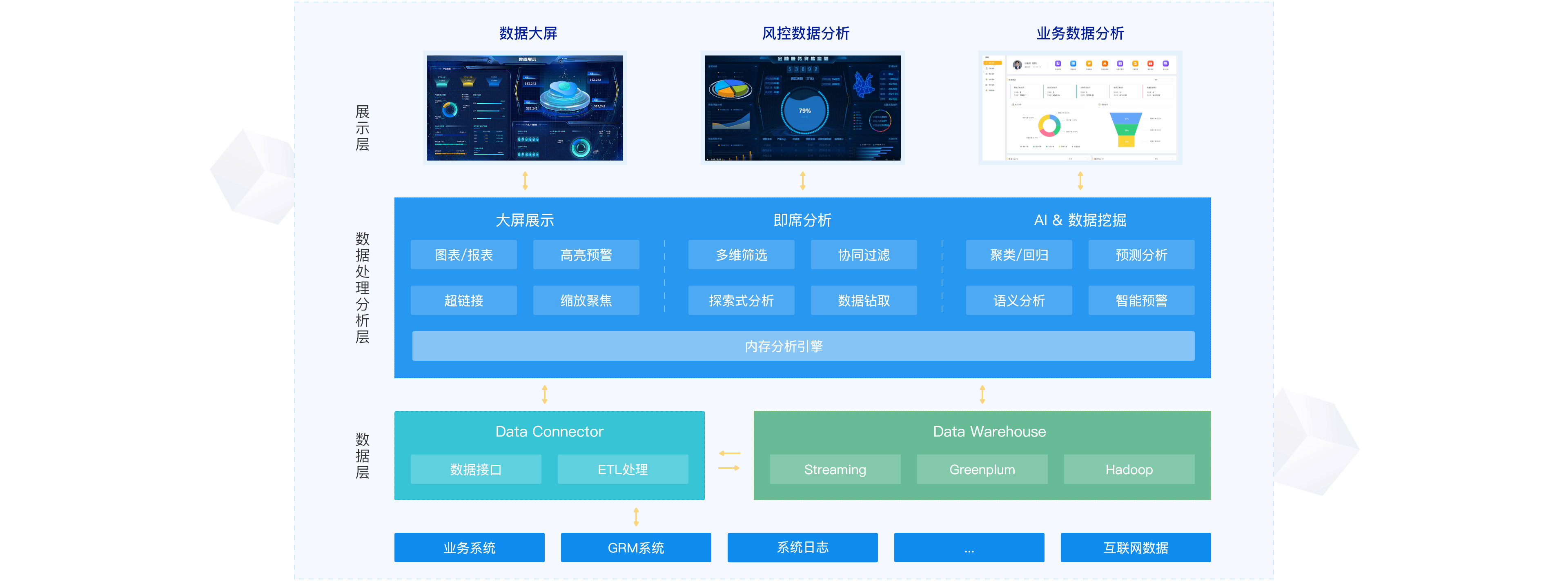 滿足大屏數(shù)據(jù)、復(fù)雜報表、數(shù)據(jù)可視化、自助探索分析、機(jī)器學(xué)習(xí)建模、預(yù)測分析、自然語言分析等全場景需求。